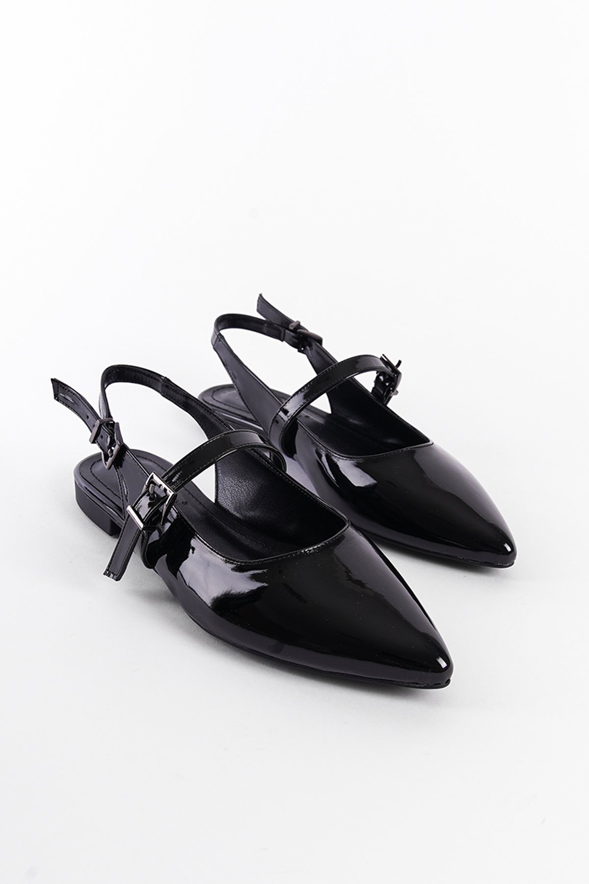 Capone Anna Open Back Banded Buckle Detailed Pointed Toe Women Patent Black Ballerinas (627-4544-FDG-01-0001)